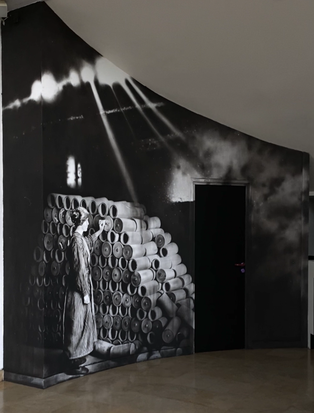 Dessiner sur un mur une jeune femme qui marque à la craie des cylindres de moteur d’avion, de guerre. Une jeune femme de 1917. On l’appellera Bénédicte. En fouillant dans les archives ouvrières de l’académie François Bourdon, il y en avait de ces « Bénédicte », ces munitionnettes s’affairant dans des « ateliers peinture », « ateliers dessin », destinés à l’artillerie. J’ai peint et dessiné dans des ateliers de beaux arts, moi, sur du papier ou des toiles, pas sur des bombes. Pas sur des bombes, qui iront exploser mon voisin, comme celles qui tueront mon frère, mon amant, mon enfant… pas sur des bombes.