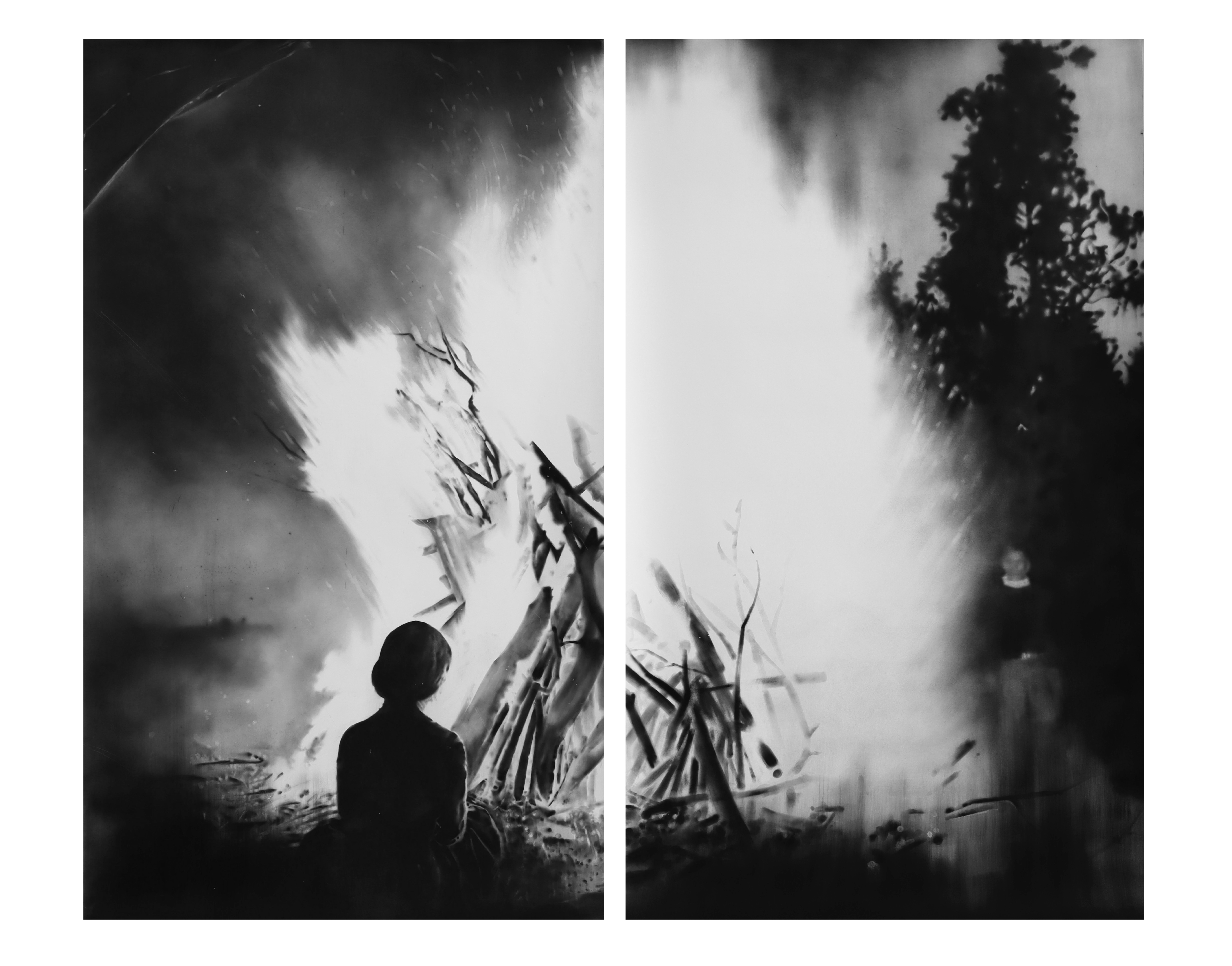 expériences qui traversent nos corps. Depuis plusieurs années, elle travaille les éléments (l’eau, le feu, l’air, la terre) pour traduire avec le noir de fumée et les pastels secs ce que nous ne parvenons pas à verbaliser, des sentiments profonds, des expériences intenses, des pertes et des métamorphoses intimes. Par là, l’artiste travaille la sidération et la contemplation, la mélancolie et l’euphorie. Alors, du portail initiatique au lieu chaleureux, en passant par la destruction, la purification, l’énergie, la passion, la peur, la beauté, la colère, le deuil, la fascination, le réconfort, l’extase, la violence et la spiritualité, le feu convoque des sentiments et des états paradoxaux qui innervent nos vies qui se consument inéluctablement.