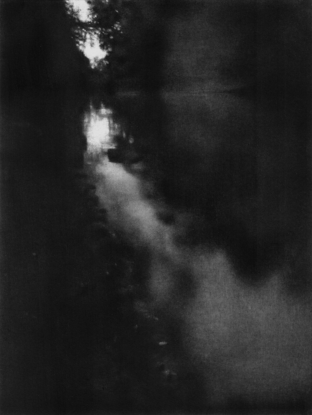 Il y a de cela, lorsque les corps se fondent les uns dans les autres, avec le paysage alentour, la brume les gagnant, la tête évaporée. Un devenir imperceptible, mais un devenir luciole. Comme cette forme blanche (peut-on parler de silhouette ?), à l’orée d’un bois (De Nuages en marécages, 04). Quelques estompes semblent avoir foulé un chemin jusqu’à elle – serait-elle réelle, aurait-elle un corps, une masse appesantie à chaque pas sur le tapis d’herbes hautes ? Un arbre s’est détaché du décor ; elle apparaît tournée vers lui et le point le plus immaculé de son être (son corsage blanc ?) converse avec d’autres points lumineux accrochés aux branches.